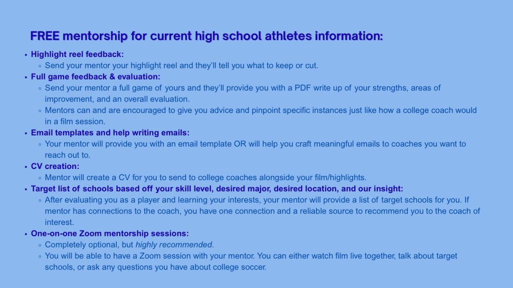 What do you get? Mentorship includes: highlight reel review and feedback, full game evaluation, CV creation, target list of schools, and one-on-one Zoom mentorship sessions.